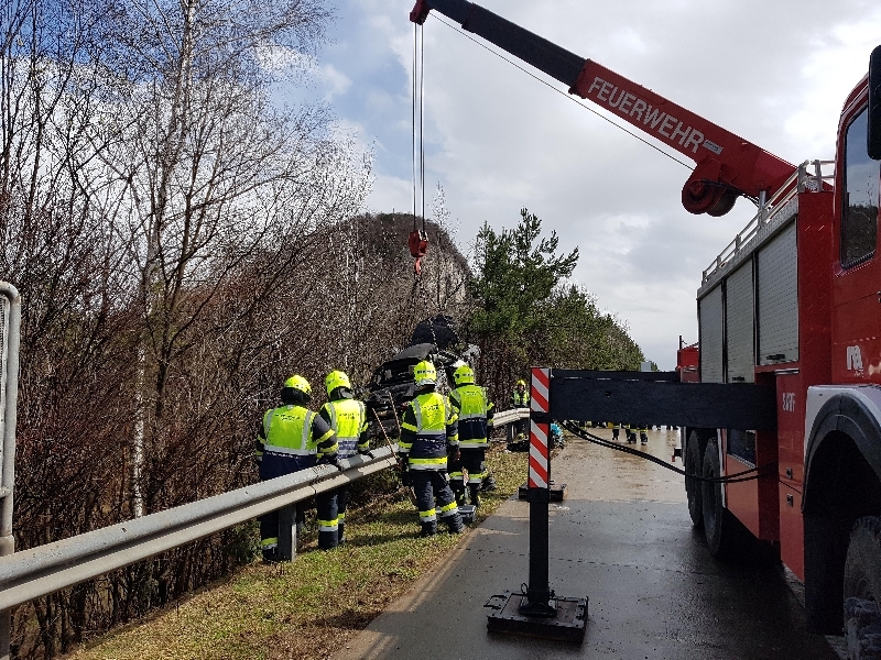 Am Einsatzort konnte festgestellt werden, dass ein PKW aus noch unbekannter Ursache von der Fahrbahn abgekommen ist, sich überschlagen und die Leitschiene durchstoßen hat. Die Bäume neben der Autobahn verhinderten dabei ein weiteres Abrutschen über die steile Böschung. Ein verletzter Insasse lag bereits neben dem PKW, ein zweiter musste durch die Einsatzkräfte der Feuerwehr gemeinsam mit dem Roten Kreuz aus dem Fahrzeug geborgen werden. Glücklicherweise war keine Person im Fahrzeug eingeklemmt. Beide Verletzten wurden vom Notarztteam des Roten Kreuzes sowie des ebenfalls angeforderten Rettungshubschrauber RK 1 erstversorgt.