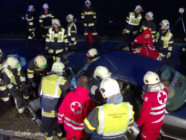 Sofort wurde unser Rüstzug in Marsch gesetzt.Beim Eintreffen der ersten Kräfte der HFW - Villach bot sich folgende Lage: 2 Pkw stießen aus noch unbekannter Ursache frontal zusammen, wobei ein Fahrzeug über den Fahrbahnrand geschleudert wurde und auf der nahengelegen Wiese zum Stillstand kam.