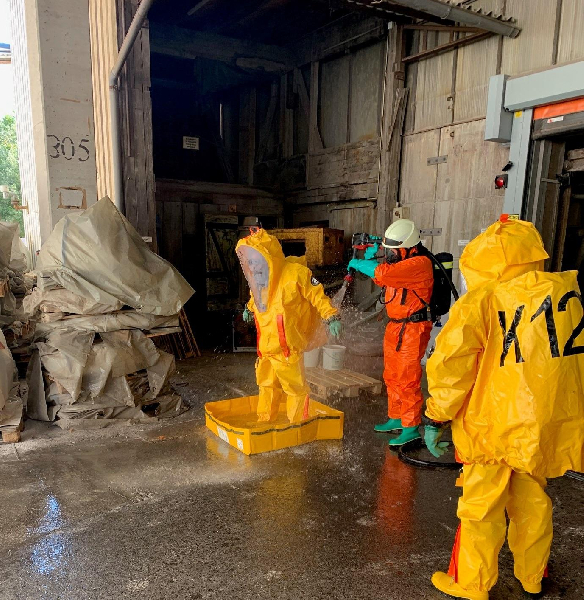 Nachdem eine Dekontaminationsstelle aufgebaut wurde, konnten mehrere Trupps in Chemieschutzanzügen und schweren Atemschutz die ausgetretene Salzsäure binden und für eine fachgerechte Entsorgung durch eine Fachfirma vorbereiten.