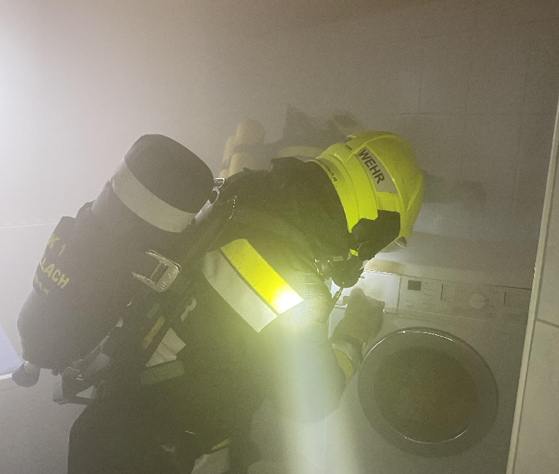 Rasch konnte der Brand gelöscht werden.  Gemeinsam mit einem weiteren Atemschutztrupp der FF Fellach wurde die abgebrannte und verkohlte Waschmaschine aus dem Keller ins Freie gebracht. Der giftige Brandrauch wurde mittels elektrischen Hochleistungslüfter ins Freie geblasen.