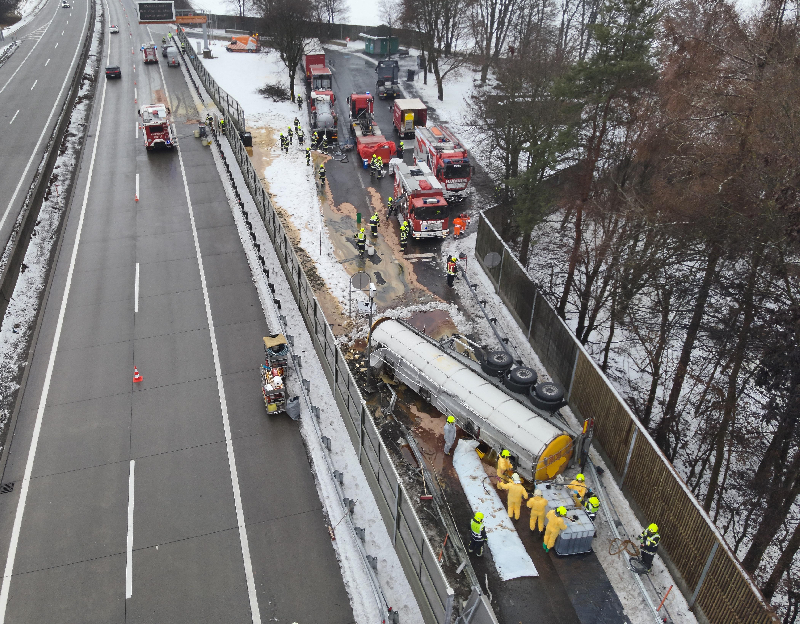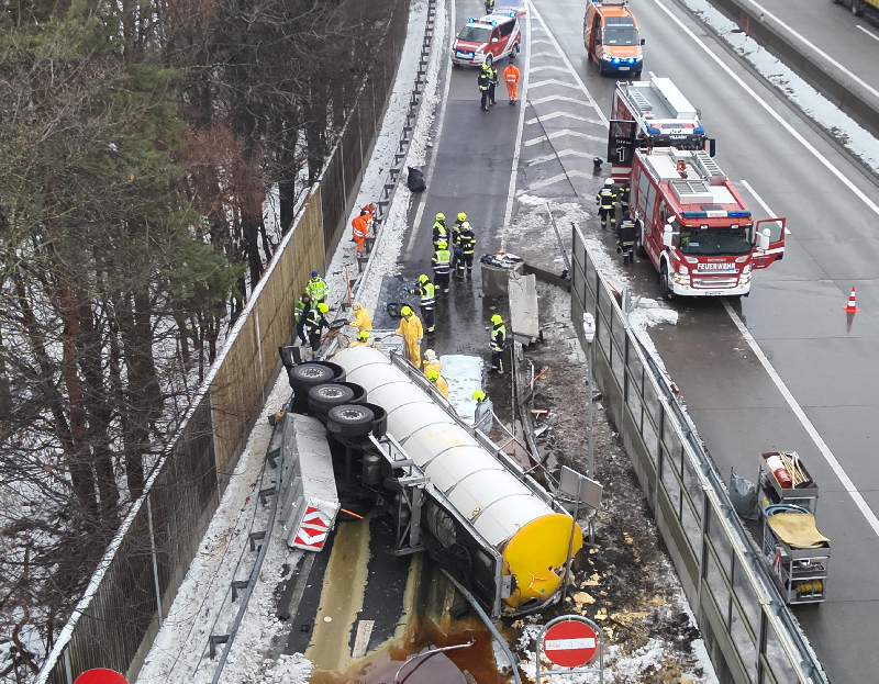 „Der Sattelauflieger war umgestürzt und verlor massiv Speiseöl. Umgehend wurden gemeinsam mit den weiteren Feuerwehren Auffangwannen untergelegt und ausgetretenes Öl mit Bindemittel gebunden, um eine Ausbreitung auf die Fahrstreifen der Autobahn zu verhindern“.