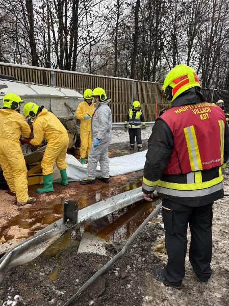 In Einwegschutzanzügen ausgerüstet, pumpten die Einsatzkräfte mittels spezieller Schadstoffpumpen das Speiseöl aus dem beschädigten Tank in bereitgestellte Behälter um. Das Saugfahrzeug der FF Velden leistete dabei wertvolle Unterstützung. Teilweise musste das aufgrund der niedrigen Temperaturen bereits stockende Öl-Bindemittel-Gemisch händisch mit Schaufeln in Kunststofffässer verbracht werden.